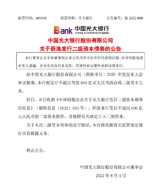 8月3日,光大银行发布公告称,近日该行收到《中国银保监会关于光大银行发行二级资本债券的批复》,同意光大银行发行不超过600亿元人民币的二级资本债券,并按照有关规定计入二级资本。