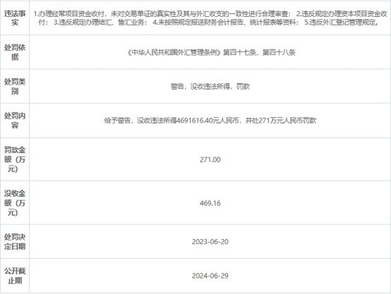 6月30日,据国家外汇管理局北京外汇管理部网站公布的行政处罚决定书,渣打银行(中国)有限公司北京分行(以下称渣打银行北京分行)被警告,没收违法所得469万元人民币,并处271万元人民币罚款。