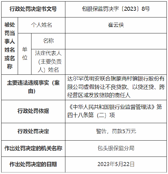 因虚假转让不良贷款等 达尔罕茂明安联合旗蒙商村镇银行被罚110万元