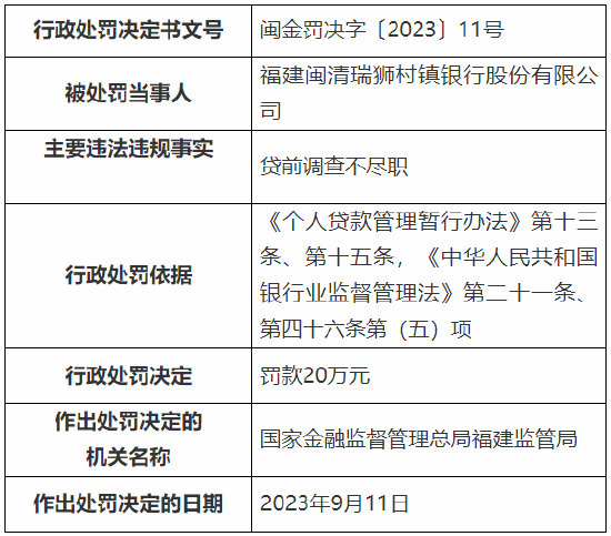 因贷前调查不尽职 福建闽清瑞狮村镇银行被罚20万元