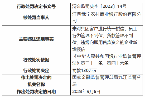 9月15日,国家金融监督管理总局九江监管分局行政处罚信息公开表显示,江西武宁农村商业银行未对集团客户进行统一授信、员工行为管理不到位、贷款管理不到位、违规向挪用贷款资金的企业新增授信,被罚款130万元。