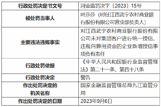 员工叶莎莎对江西武宁农村商业银行未对集团客户进行统一授信、违规向挪用资金的企业新增授信事项负有责任,被处以警告。