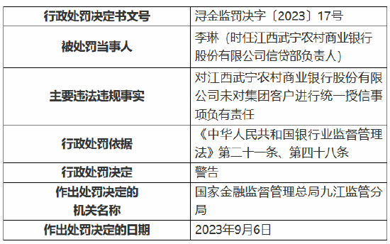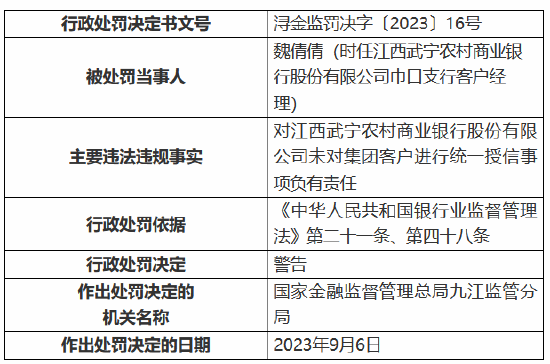 员工魏倩倩、李琳对江西武宁农村商业银行未对集团客户进行统一授信事项负有责任,被处以警告。