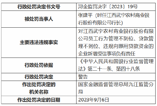 员工卢军对江西武宁农村商业银行贷款管理不到位事项负有责任,被处以警告。