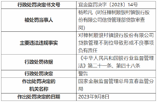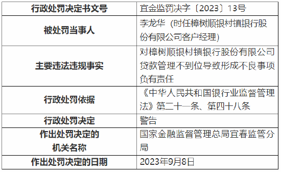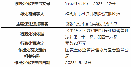 9月18日,国家金融监督管理总局宜春监管分局发布的行政处罚信息公开表显示,樟树顺银村镇银行因贷款管理不到位导致形成不良,被国家金融监督管理总局宜春监管分局罚款30万元;同时,两名相关责任人李龙华、杨希凡被警告。