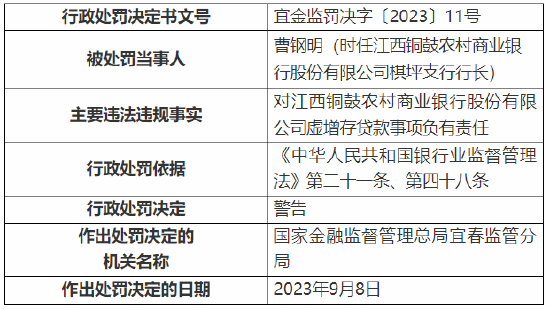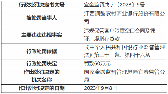 9月18日,国家金融监督管理总局宜春监管分局发布的行政处罚信息公开表显示,江西铜鼓农村商业银行因违规保管客户签章空白合同及凭证、虚增存贷款,被国家金融监督管理总局宜春监管分局罚款60万元;同时,两名相关责任人付珊、曹钢明被警告。