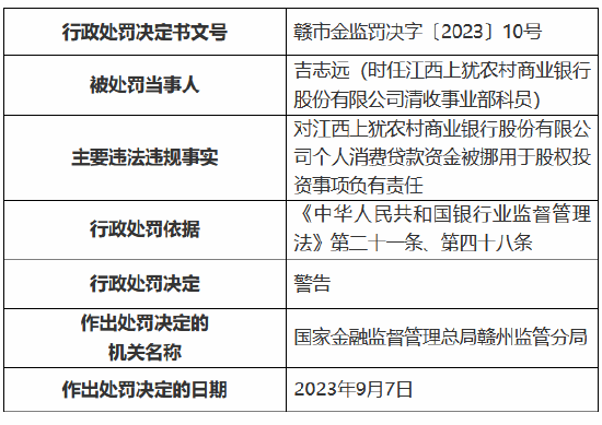 其员工孔燕、吉志远对江西上犹农商行个人消费贷款资金被挪用于股权投资事项负有责任,被处以警告。