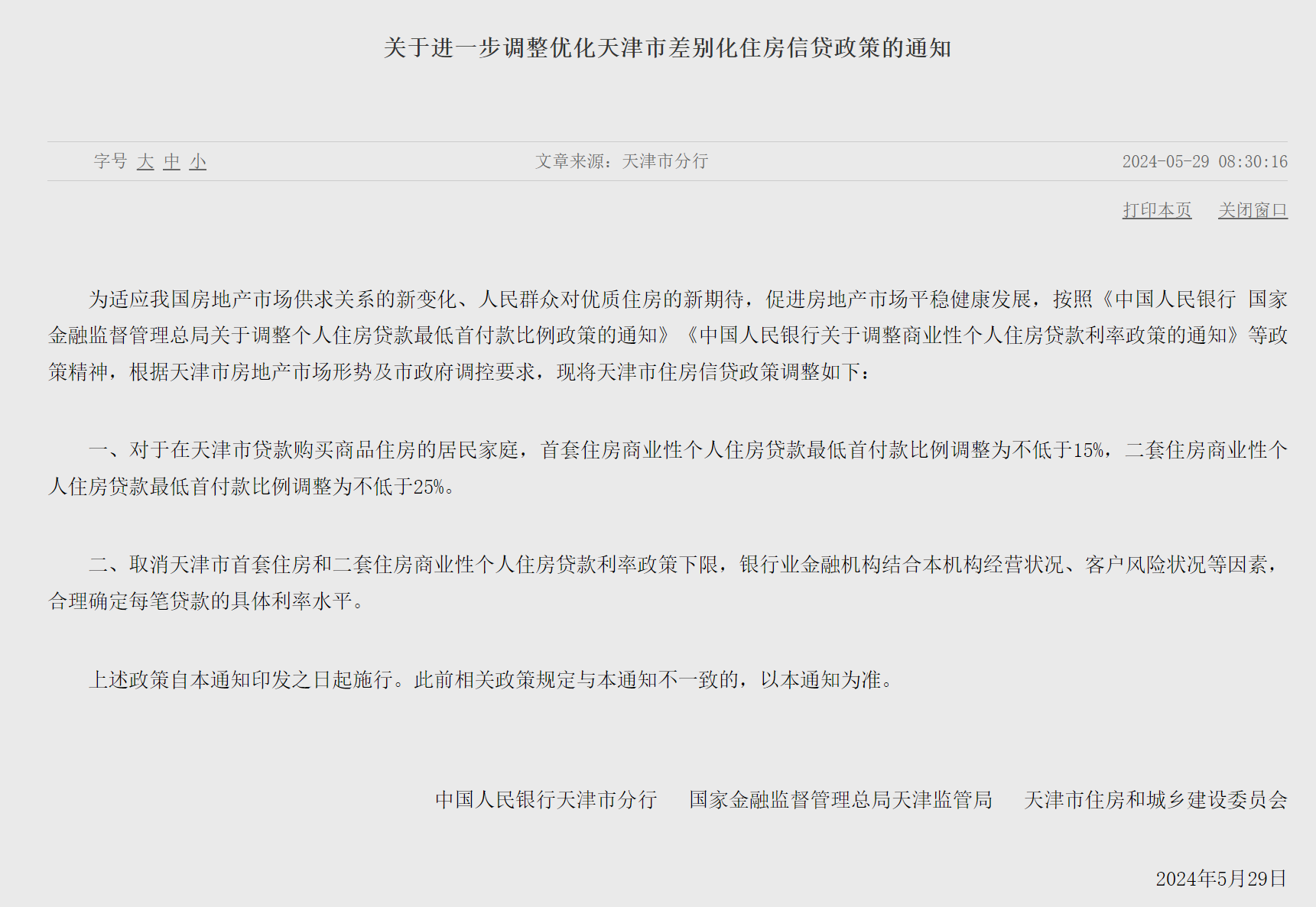 5月29日,据中国人民银行天津市分行消息,为适应我国房地产市场供求关系的新变化、人民群众对优质住房的新期待,促进房地产市场平稳健康发展,按照《中国人民银行 国家金融监督管理总局关于调整个人住房贷款最低首付款比例政策的通知》《中国人民银行关于调整商业性个人住房贷款利率政策的通知》等政策精神,根据天津市房地产市场形势及市政府调控要求,现将天津市住房信贷政策调整如下: