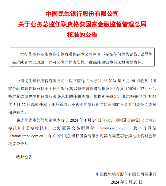 5月30日,民生银行发布公告称,公司于 2024 年 5 月 28 日收到《国家金融监督管理总局关于民生银行龚志坚任职资格的批复》(金复〔2024〕371 号), 核准龚志坚担任该行业务总监的任职资格。根据相关规定,龚志坚自 2024 年 5 月 27 日起就任民生银行业务总监,不再继续履行职工监事和监事会专门委员会委员相关职责。