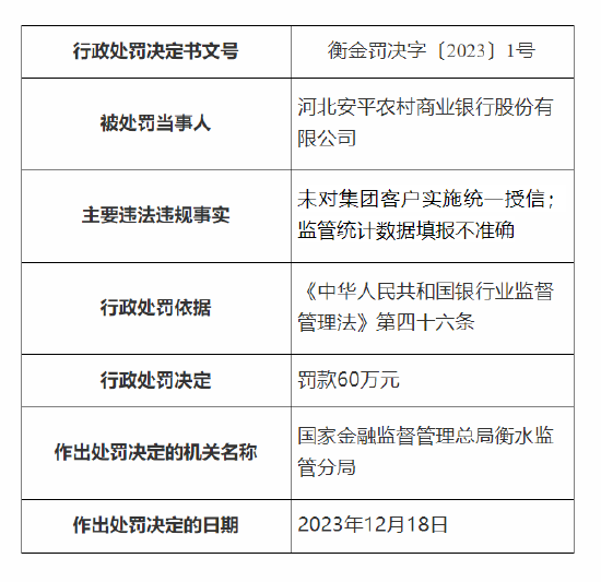 河北安平农村商业银行被罚60万元,涉及未对集团客户实施统一授信等
