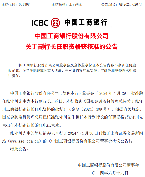 6月19日,工行公告显示,张守川任该行副行长的任职资格获批。