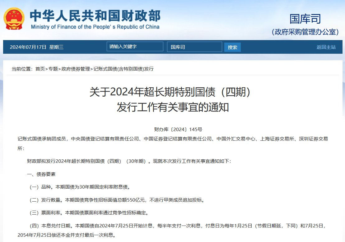 财政部拟发行2024年超长期特别国债(四期), 竞争性招标面值总额550亿元