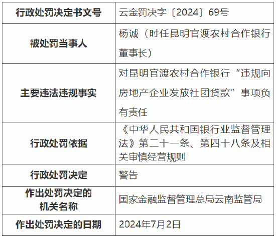 杨诚时任昆明官渡农村合作银行董事长,对昆明官渡农村合作银行“违规向房地产企业发放社团贷款”事项负有责任,被监管警告。