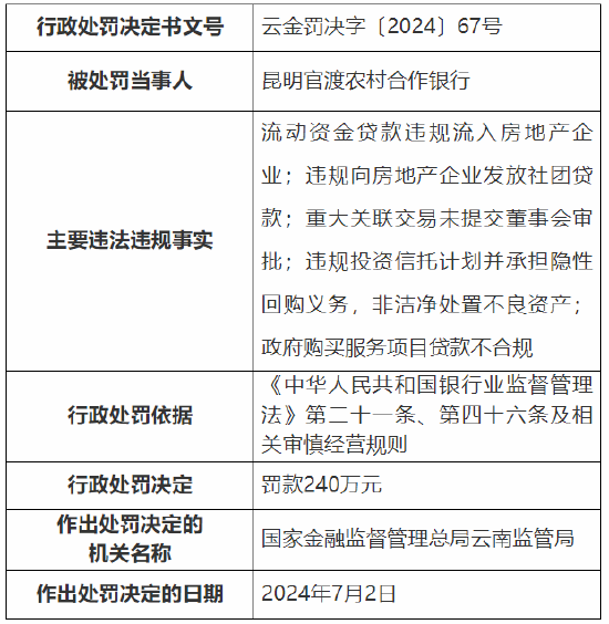 7月22日金融一线消息,国家金融监督管理总局云南监管局行政处罚信息公开表显示,昆明官渡农村合作银行因流动资金贷款违规流入房地产企业、违规向房地产企业发放社团贷款、重大关联交易未提交董事会审批、违规投资信托计划并承担隐性回购义务,非洁净处置不良资产以及政府购买服务项目贷款不合规,被国家金融监督管理总局云南监管局罚款240万元;