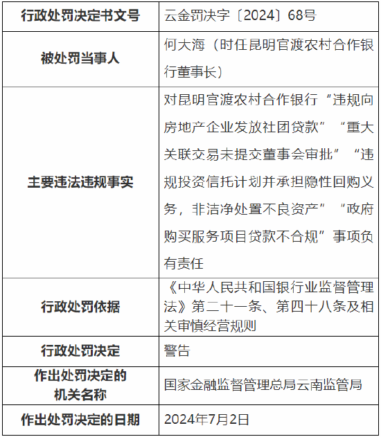 何大海时任昆明官渡农村合作银行董事长,对昆明官渡农村合作银行“违规向房地产企业发放社团贷款”“重大关联交易未提交董事会审批”“违规投资信托计划并承担隐性回购义务,非洁净处置不良资产”“政府购买服务项目贷款不合规”事项负有责任,被监管警告;