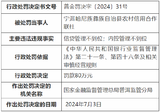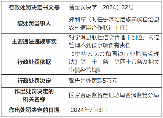 7月23日,国家金融监督管理总局普洱监管分局行政处罚信息公开表显示,宁洱哈尼族彝族自治县农村信用合作联社因信贷管理不到位、内控管理不到位,被国家金融监督管理总局普洱监管分局罚款80万元;郑利军时任宁洱哈尼族彝族自治县农村信用合作联社主任,对宁洱县联社信贷管理不到位、内控管理不到位事项负有责任,被监管警告并处罚款5万元。