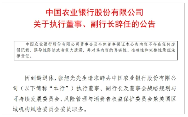 10月31日,中国农业银行发布公告称,因到龄退休,张旭光辞去该行执行董事、副行长及董事会战略规划与可持续发展委员会、风险管理与消费者权益保护委员会兼美国区域机构风险委员会委员职务。
