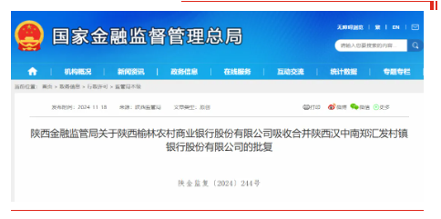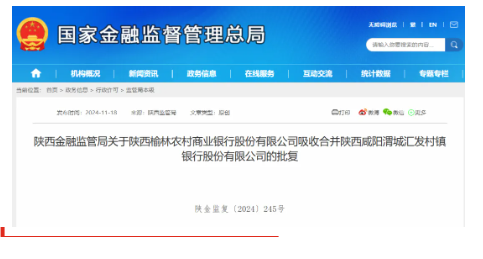 11月18日,金融监管总局披露的批复显示,同意陕西榆林农村商业银行股份有限公司(以下简称“陕西榆林农商银行”)吸收合并陕西汉中南郑汇发村镇银行、陕西咸阳渭城汇发村镇银行,并承接两家村镇银行清产核资后的资产、负债、业务和员工。