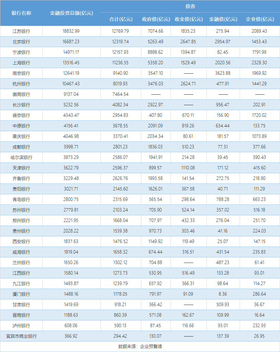 这三十家城商行金融投资总额合计约15.51万亿元。江苏银行以1.88万亿元位居首位。北京银行(1.67万亿元)和宁波银行(1.50万亿元)分别位居第二、三位。