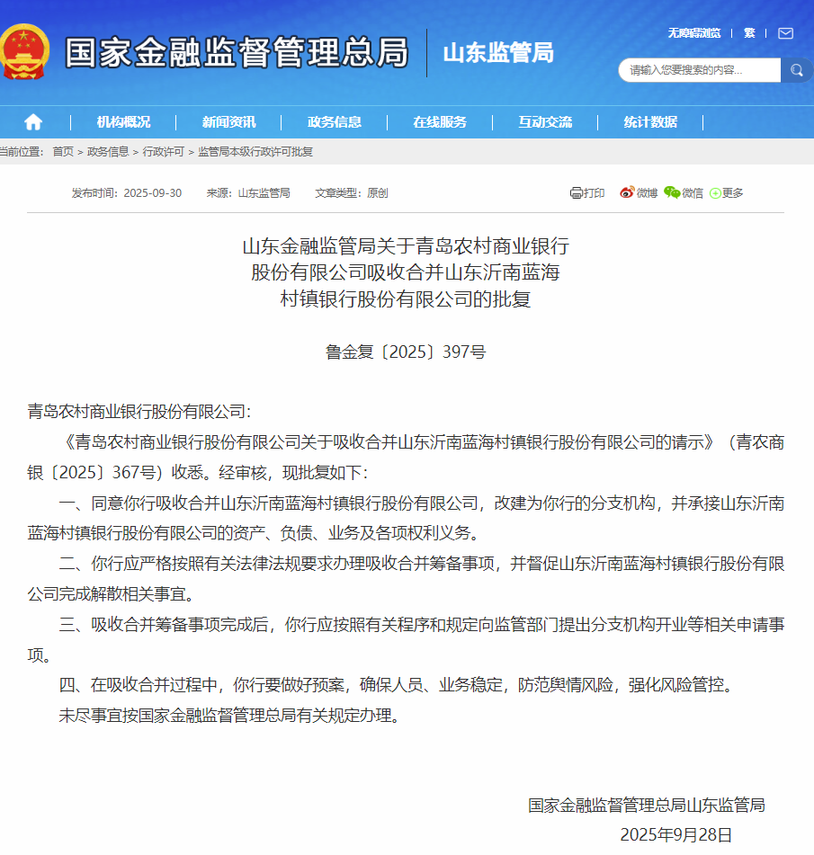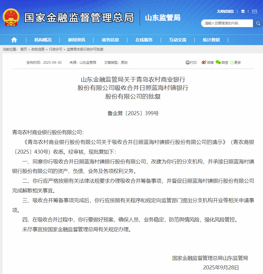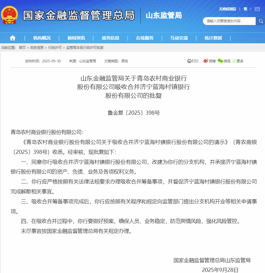 据山东金融监管局网站 9月30日,山东金融监管局发布多条批复,同意青岛农村商业银行股份有限公司吸收合并山东沂南蓝海村镇银行股份有限公司、日照蓝海村镇银行股份有限公司、济宁蓝海村镇银行股份有限公司。