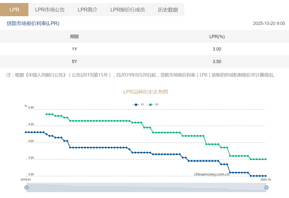 中国人民银行授权全国银行间同业拆借中心公布,2025年10月20日贷款市场报价利率(LPR)为:1年期LPR为3.0%,5年期以上LPR为3.5%,连续5个月“按兵不动”。