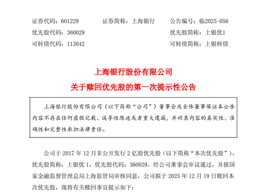 日前,上海银行发布关于赎回优先股的第一次提示性公告,宣布拟于2025年12月19日全额赎回2017年12月非公开发行的“上银优1”优先股(优先股代码:360029),相关事宜已完成监管审核及内部决策流程。
