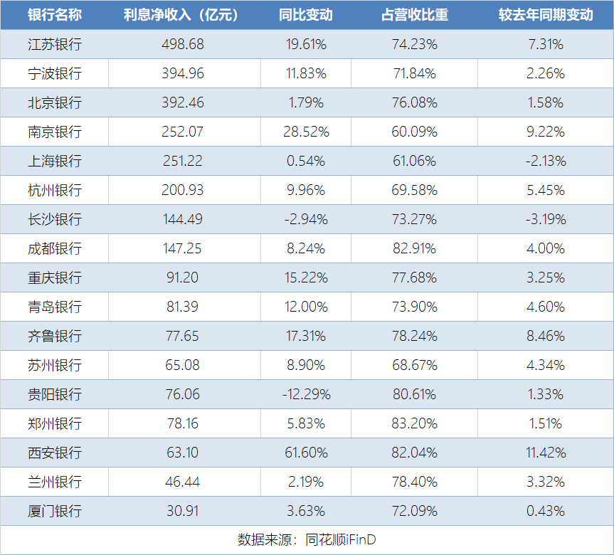 利息净收入作为银行传统主业收入,仍然是城商行营收的主要来源。江苏银行利息净收入达498.68亿元,同比增长19.61%,无论是规模还是增速均在城商行中居前。宁波银行、北京银行的利息净收入也分别达到394.96亿元和392.46亿元。