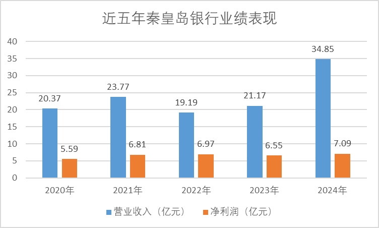 业绩表现方面,近五年秦皇岛银行营收净利呈波动趋势。企业预警通数据显示,营收方面,2021年、2023年和2024年该行营收均实现大幅增长,同比增幅分别为16.69%、10.32%和64.62%,而2022年该行营业收入为19.19亿元,同比下降19.27%。中诚信国际在秦皇岛银行2023年跟踪评级报告中指出,2022年受到债券市场波动影响,该行投资收益和公允价值变动收益大幅减少,全年该行实现非利息净收入7.08亿元,较上年下降41.44%,在净营业收入中的占比同比下降13.97个百分点至36.92%,叠加同业竞争加剧、减费让利政策和市场利率下行影响致使营收下滑。