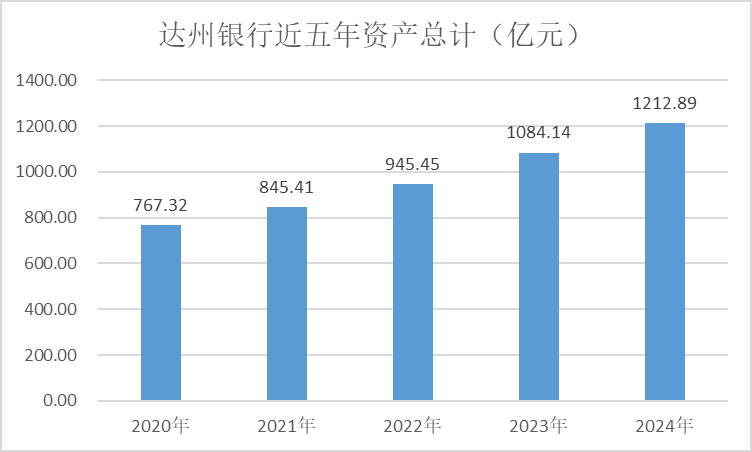 企业预警通数据显示,近五年来达州银行资产规模稳步增长。总资产自2020年末的767.32亿元持续增长至2024年末的1212.89亿元,五年间累计增幅达58.07%。