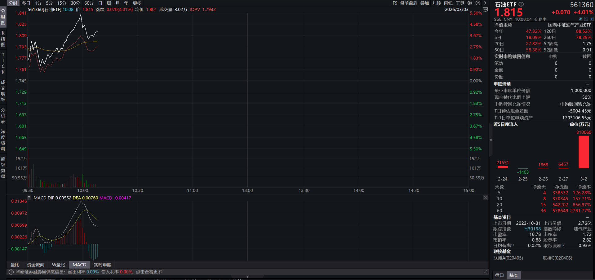 规模与流动性俱佳。截至2026年3月3日,石油ETF规模65.95亿,是标的指数为中证油气产业指数的ETF中流通规模最大的ETF。近期获得大额净申购,规模迎来翻倍,二级市场交投活跃,买卖冲击成本低。